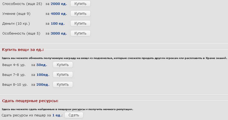Помимо стандартной покупки Способности, Умения, Особенности и Кредитов, добавлена возможность покупки вещей 4-10 ур. за репутацию, а также сдача пещерных ресурсов за репутацию.
